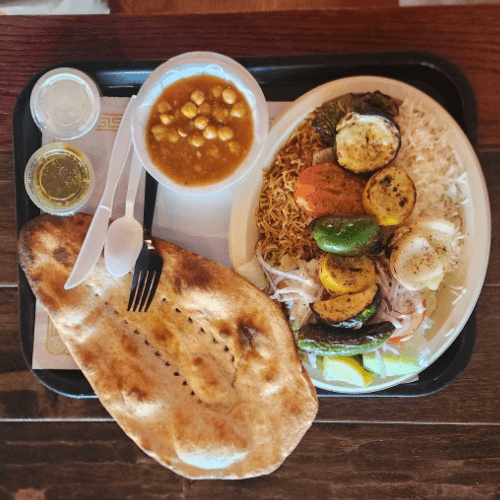 Served with white rice and brown rice, tandoori bread, white sauce and green sauce, and is served with 3 sides out of the four options (chickpeas, spinach, potato curry, chicken curry)