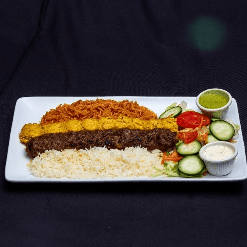 10 skewers of ground meat (Chicken or Beef), 10 skewers of chunks of ( chicken breast or Beef) with White Rice,Brown Rice,Chickpeas, Salad, Bread, White sauce and green Sauce. FEEDS 20