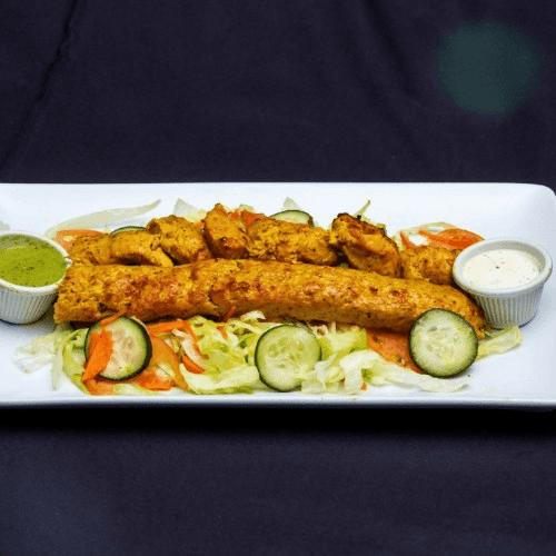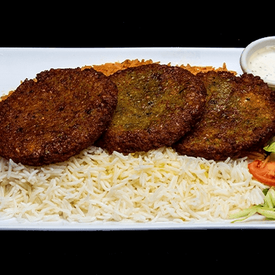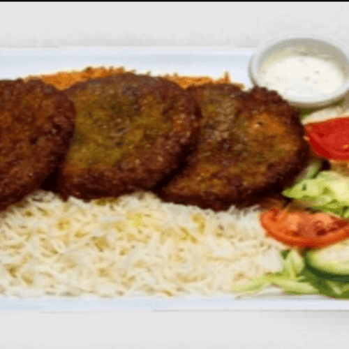 Veggie kabob made from potato and chickpeas and Served with Rice, Salad, Naan (Bread) and Sauces.