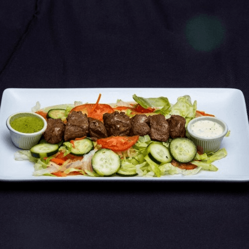 Served with Rice, salad, Chickpeas, Naan( Bread) and sauces