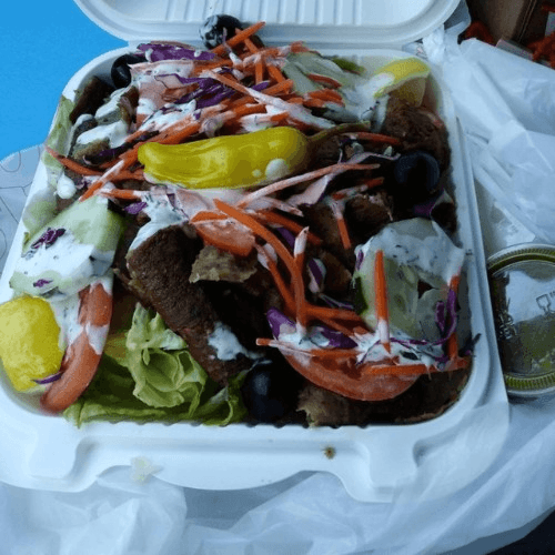 Shaved lamb & beef Served with Rice, Salad, Chickpeas, Naan and sauces.